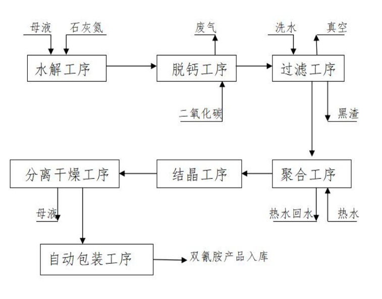 將水或母液打入攪拌罐,經(jīng)石灰氮磨細(xì)后定量均勻地加入配漿槽充分?jǐn)嚢?,使石灰氮完全水解,生成氰胺氰鈣液,再將水解液經(jīng)泥漿泵送入碳化塔,與來自石灰窯的經(jīng)過壓縮后進(jìn)入碳化塔的二氧化碳?xì)怏w(窯氣)完全接觸反應(yīng),完成石灰氮水溶液的脫鈣過程。將水解脫鈣反應(yīng)完成后的料液加入帶濾機,將石灰氮中水解碳化的雜質(zhì)以及碳化過程中生成的碳酸鈣固體濾掉,得到純凈的單氰胺溶液;將單氰胺水溶液打入聚合鍋,經(jīng)蒸汽加熱至 70℃,并調(diào)整 PH 值為 10 左右,完成聚合過程,生成雙氰胺。再將雙氰胺水溶液放入抽濾桶,過濾掉聚合過程中生成的白灰等雜質(zhì),再經(jīng)硅藻土過濾機過濾得到純凈的雙氰胺溶液;將純凈的雙氰胺溶液打入結(jié)晶鍋,通過冷凍站來的低溫水雙氰胺水溶液進(jìn)行降溫、結(jié)晶,在溶液中析出雙氰胺固體;將結(jié)晶鍋中的溶液放出,經(jīng)抽濾桶過濾,其中雙氰胺晶體經(jīng)離心機甩干,再經(jīng)流化床干燥機干燥,得到雙氰胺成品;將濾掉的雙氰胺母液送入配漿槽作為石灰氮水解用,完成工藝系統(tǒng)的密閉循環(huán)。